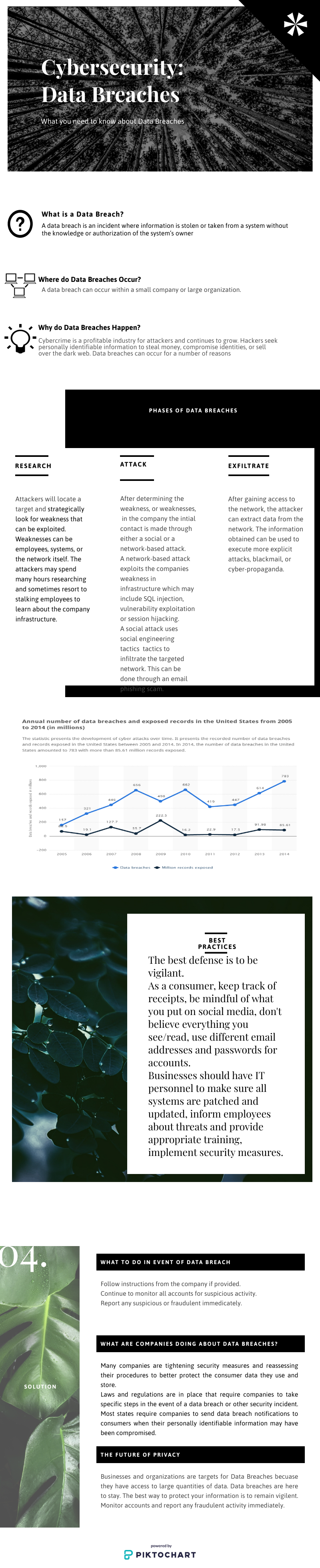 For this assignment we were to research cybersecurity. We were to choose a topic that interested us and create a Piktochart that could be used to educate the public on our topic. I chose to research Data Breaches. These seem to be happening very frequently and I often get emails from credit monitoring sites indicating one of my accounts may have been involved in a breach. I felt this topic is relevant to everyone because almost every company is vulnerable to a data breach.
